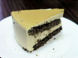ココア入りスポンジにガナッシュクリームを塗り、その上にキャラメル風味の ババロアを流すという工程を2度繰り返し、冷蔵庫に入れ、ババロアが固まったら、 りんごジュースで作ったゼリーを上に注ぎ、再び冷蔵庫で冷やし完成させたケーキ です。 見た目:☆☆☆☆☆ お味 :☆☆☆☆ 難度 :☆☆☆☆☆ ひとこと:とにかく手のかかるケーキです。キャラメルを作ること4回! でも、満足のできる仕上がりとなりました。