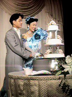このウエディングケーキは、今田美奈子お菓子教室の名古屋分校である、 大山理子お菓子教室に通い、半年を費やして完成させたものです。 殆どがお砂糖でできています。 一番下と真ん中のケーキは、結婚式当日に幸せのおすそわけとして 出席して下さったお客様にお渡ししました。一番上は記念にと 今はガラスケースに入れて、新居の玄関に飾ってあります。 (ケーキだけの写真が見当たらず、私たちまで写っていますが、 それはご愛嬌ということで。見つかったら照れちゃうかな>旦那さま)